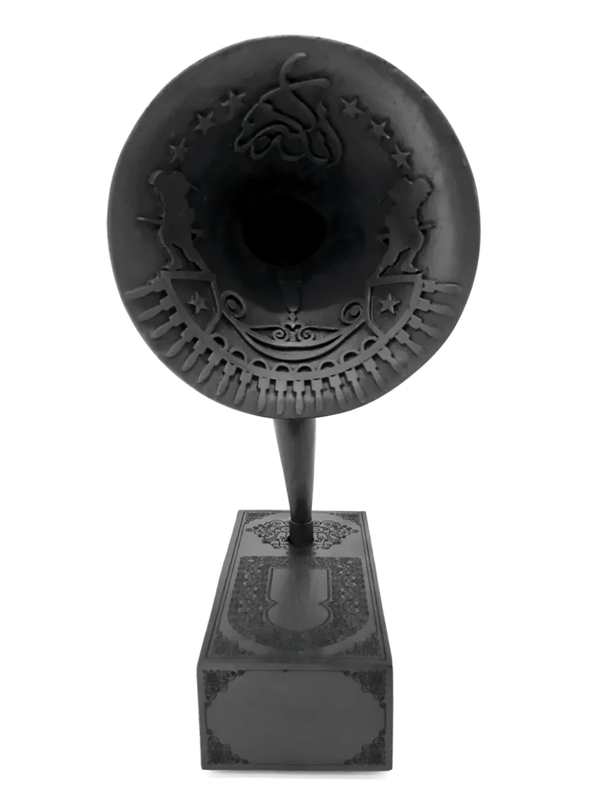 Rushdi Anwar, Listen again to the drum sound rising in the air; the truth is treason in the empire of lies, 2023. Brass, walnut wood, teak wood, Bluetooth sound system, sound. 53 x 28 x 32 (irregular); 20mins, looped. Photo: Rushdi Anwar. Photo courtesy of Rushdi Anwar