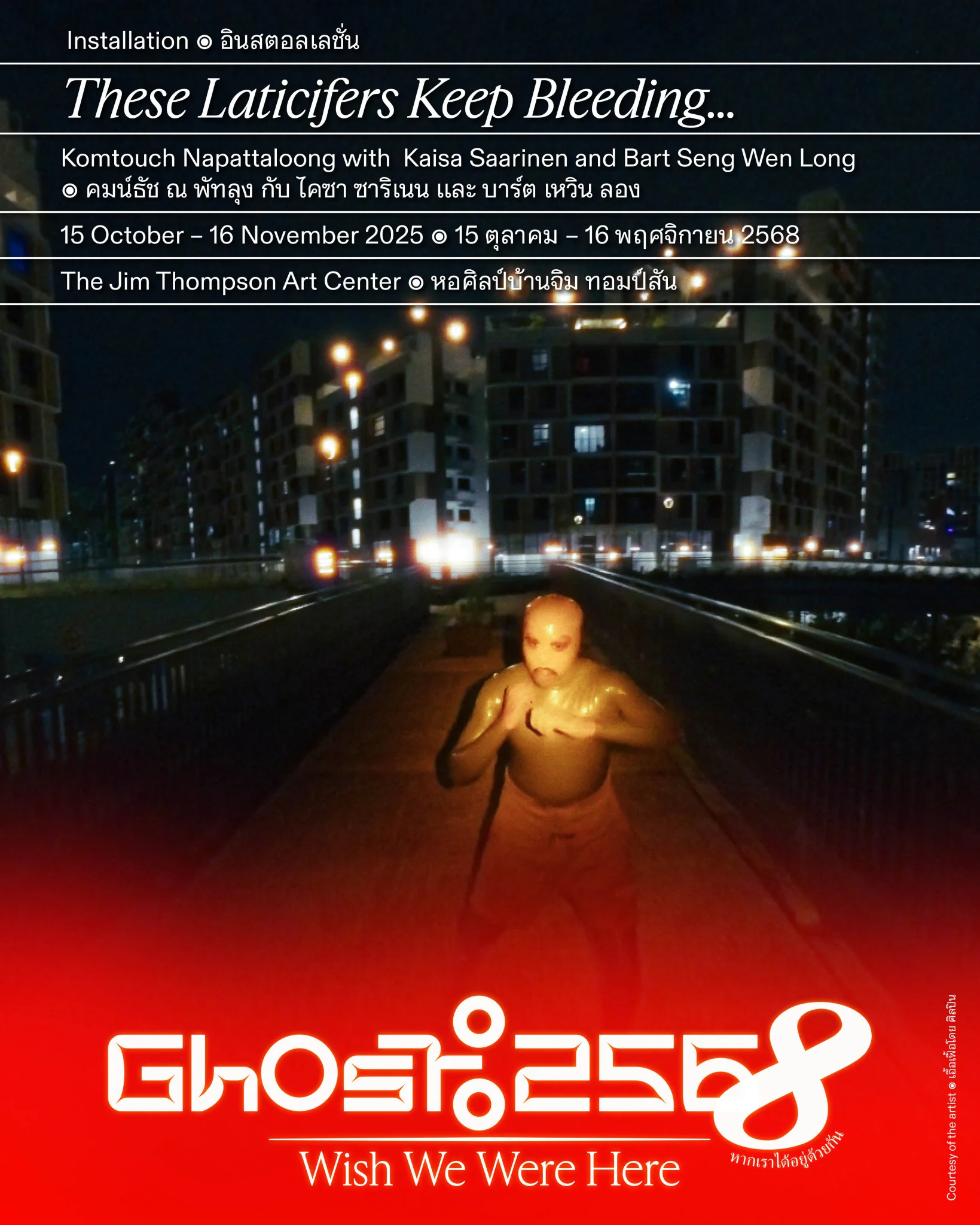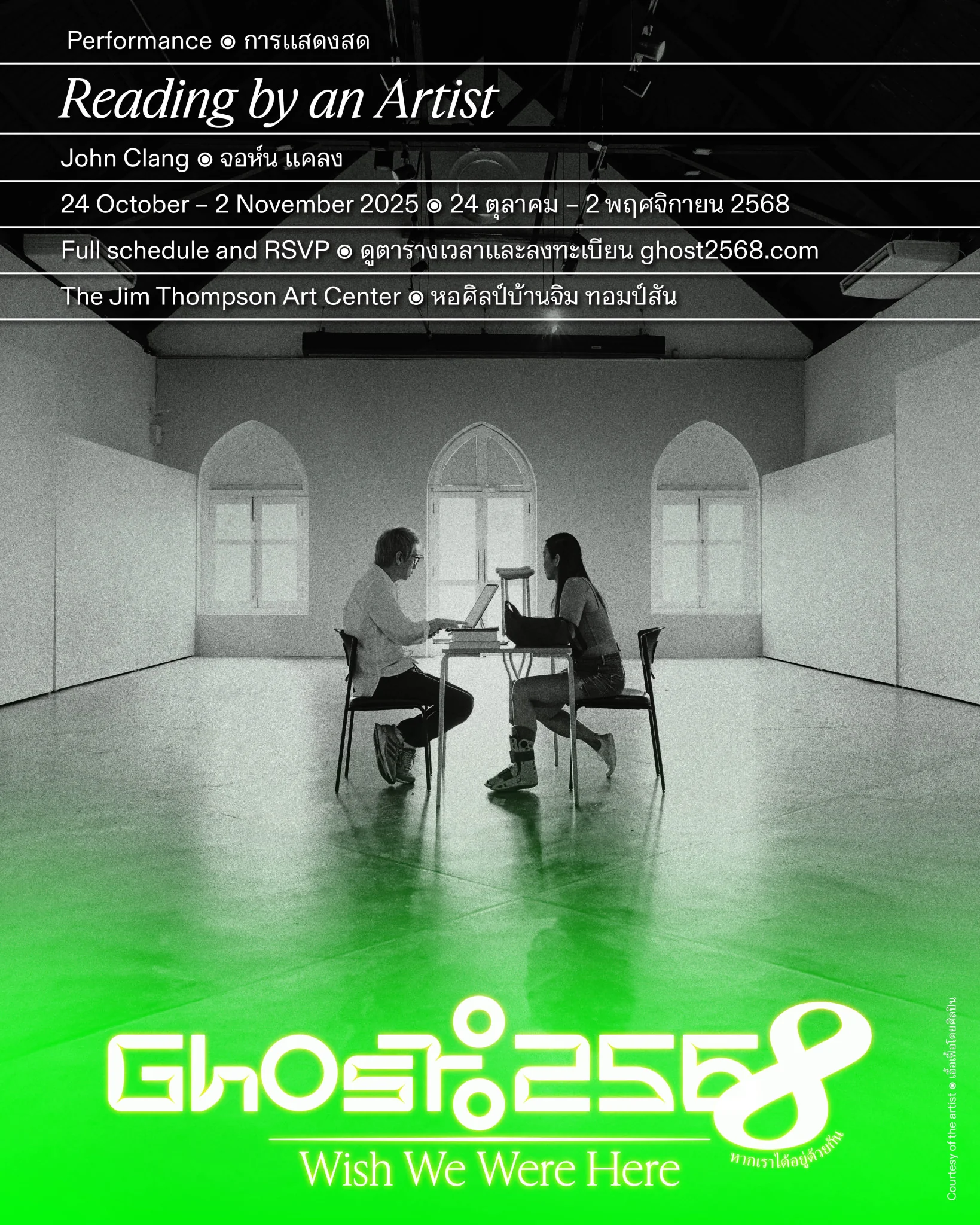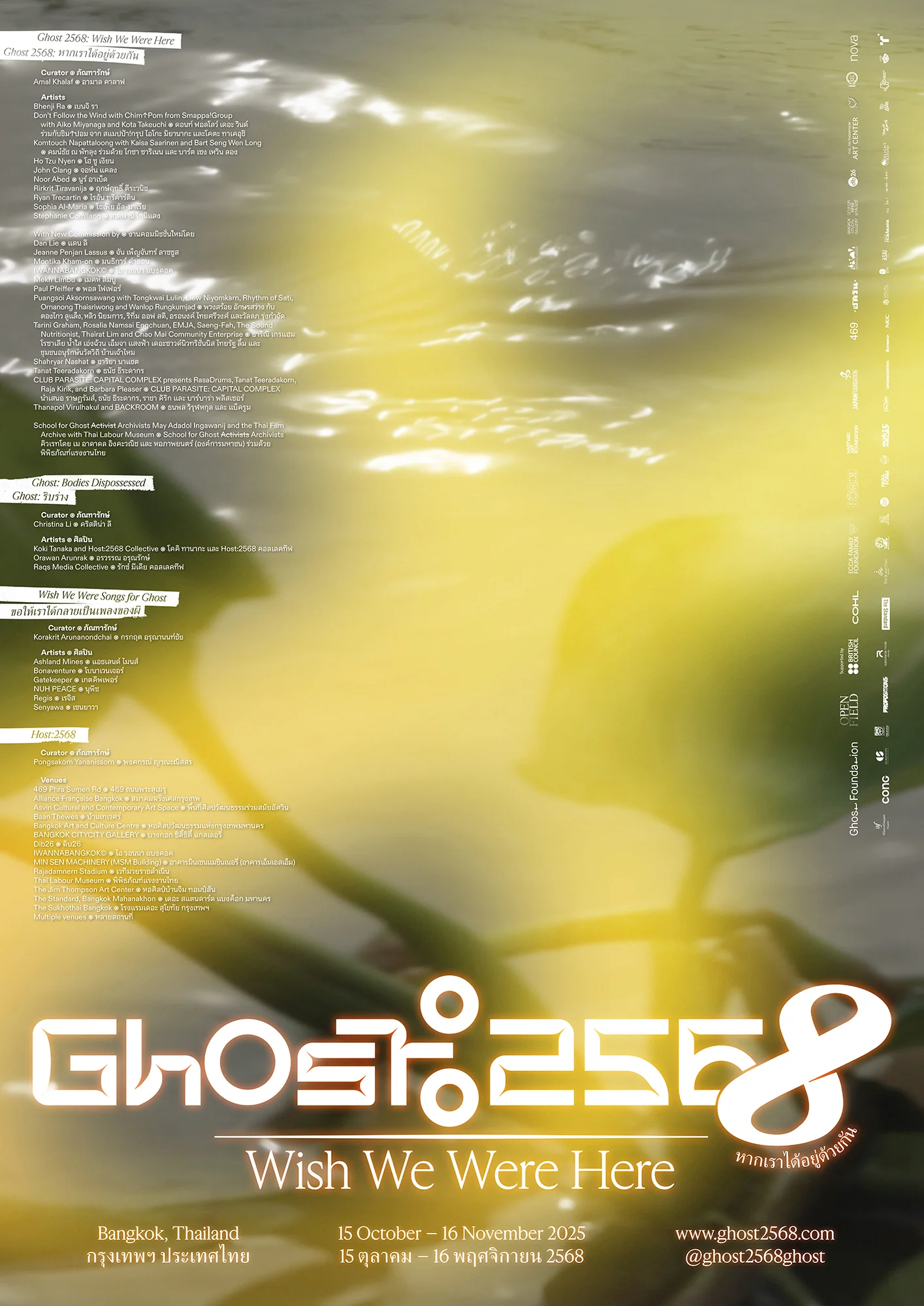 The third and final edition of Ghost, a video and performance art series—Ghost 2568: Wish We Were Here, curated by Amal Khalaf— takes place from 15 October – 16 November, 2025, across 8 venues in Bangkok. The curators of the first two editions, Christina Li and Korakrit Arunanondchai, return to “haunt” Ghost:2568 with special projects and Host returns, an alternative pedagogical platform by Pongsakorn Yananissorn.