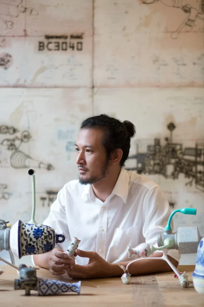 His work features sculptures in hard-wood, slate, organic fibers, and various types of metal using precise mathematic calculations while incorporating handcrafted elements. His works play with the aspect of the world’s gravity to challenge the viewers’ understanding of volume and space, communicating with and questioning ego and impermanence in Buddhist philosophy.