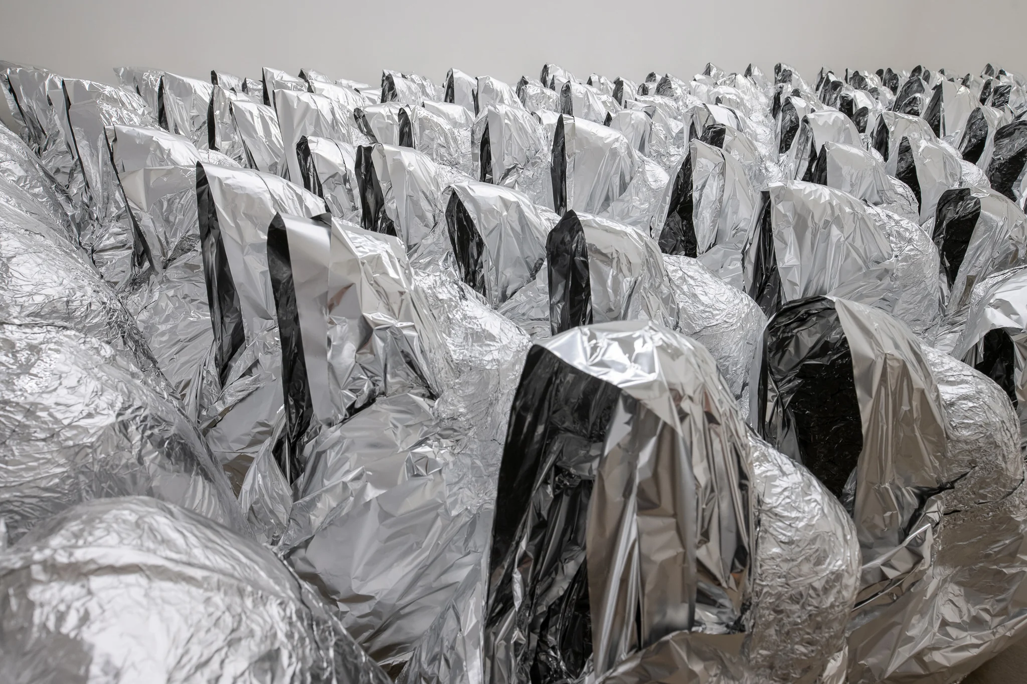 Kader Attia, Ghost, 2007/2024. Installation: life-size figures, aluminum foil, Dimension variable. Exhibition copy.Photo: Swita Uancharoenkul. Courtesy of the Jim Thompson Art Center and the James H.W. Thompson Foundation © Jim Thompson Art Center