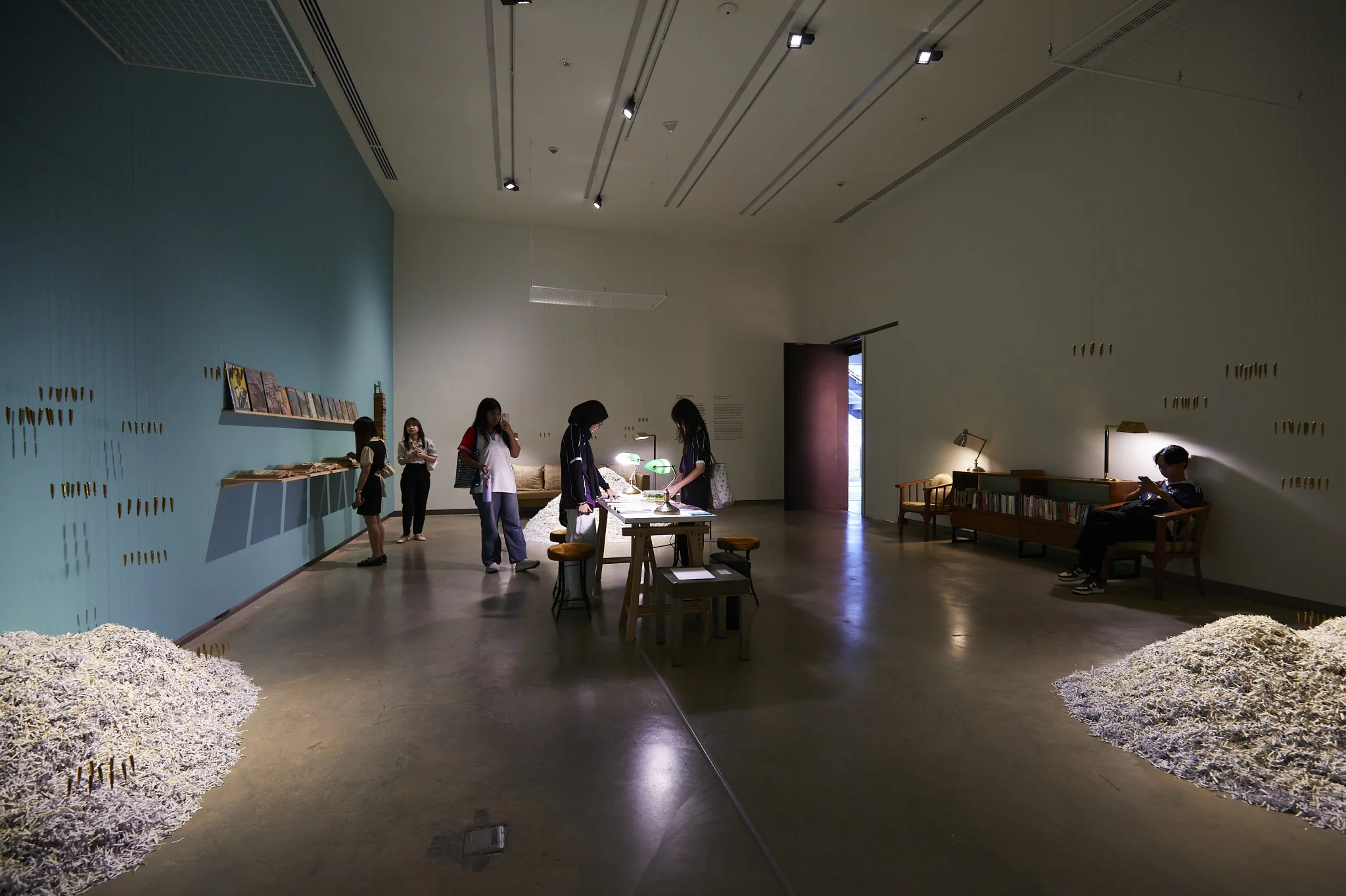 Installation: 360 bullet shells size 5.56 x 45 mm, copper wires No. 38, Banned/restricted books and propaganda books and magazines produced by the United States Information Service (USIS), a paper shredder, Strip-cut photocopy paper shreds (Greenleaf and white papers),