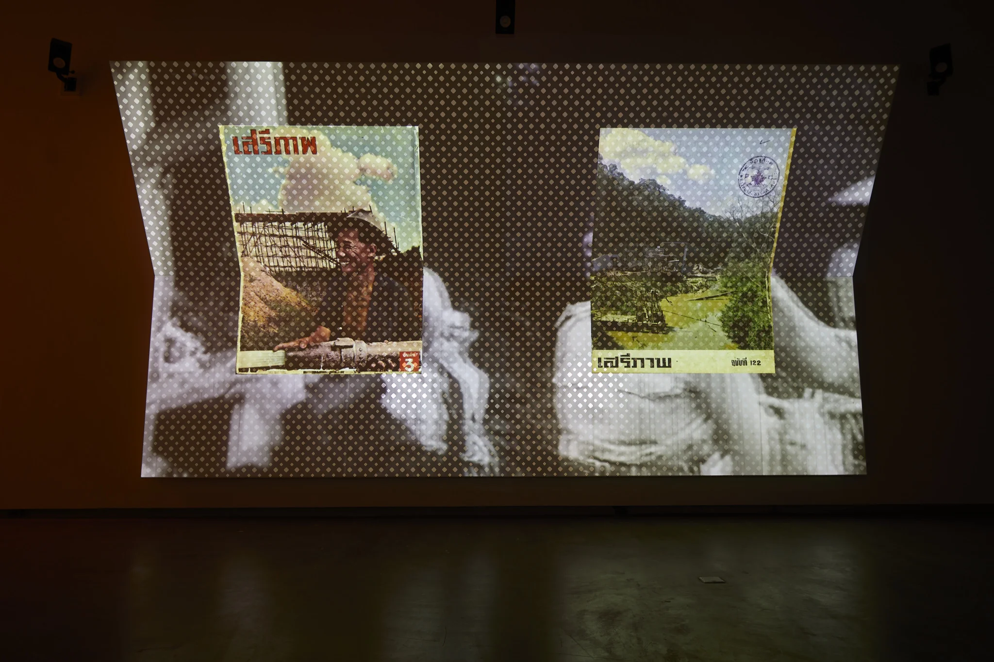 Through research journeys across Laos, Thailand, and Vietnam, Supaparinya excavates micro-histories embedded in these sites, revealing missing links between regions often discussed in isolation. The video combines her own footage with archival images and texts drawn from FREEDOM (Seriphap), a magazine produced by American agencies during the Cold War as part of a psychological campaign to promote U.S. values and the idea of the “free world.” From these materials, she extracts headlines and slogans that framed massive infrastructure projects—particularly highways and dams—as symbols of progress, development, and international friendship.