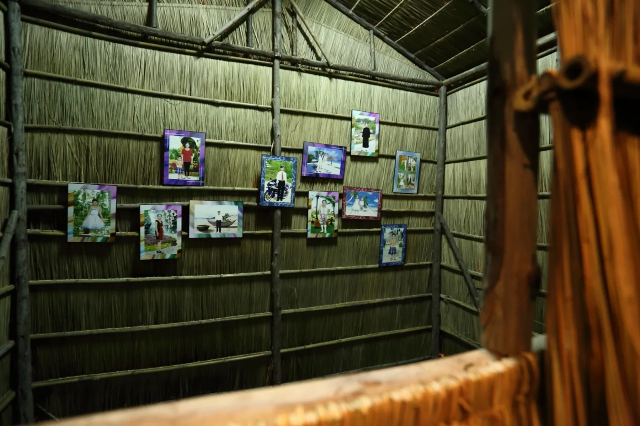 Day by Day (2014-7) by Nguyen Thi Thanh Mai explores the experience of stateless Vietnamese migrant communities living in floating villages in Cambodia and in Vietnam. These communities have faced decades of hardship, including persecution during the American War in Vietnam and the Khmer Rouge in Cambodia, and continue to be denied many human rights including basic education and healthcare, as a result of being unable to obtain legal identification documents from either nation. The project consists of a one-hour video, a participatory installation of false ‘identity cards,’ and a series of collaborative digital photographic collages installed inside a small hut constructed in the gallery space from coconut-leaf thatching.