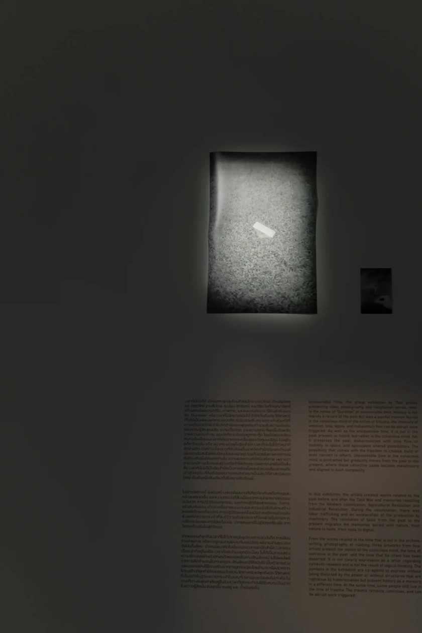 Uncountable Time, the group exhibition by Thai artists present video, photography, and installation works refer to the notion of “Duration” or uncountable time. History is not merely a record of the past but also a painful memoir buried in the conscious mind of the victim or trauma, the intensity of emotion, loss, agony, and melancholy that can be abrupt once triggered. As well as the uncountable time, it is not in the past, present, or future, but rather in the conscious mind. Yet, it preserves the past, disharmonizes with time flow or mobility in space, and speculates altered possibilities. The possibility that comes with the freedom to choose, build or even convert to others. Uncountable time in the conscious mind is protracted, but gradually moves from the past to the present, where these collective pasts become metahistory and aligned in such complexity.