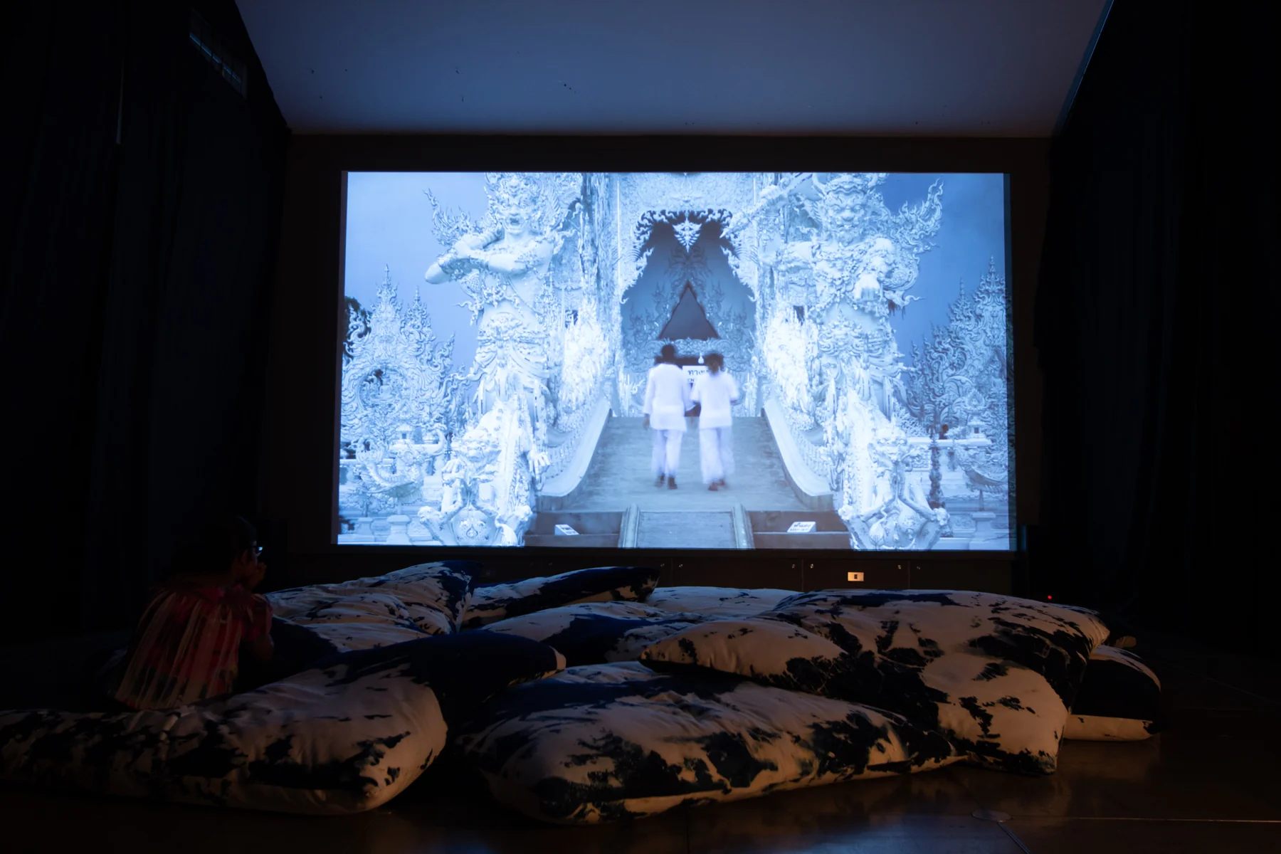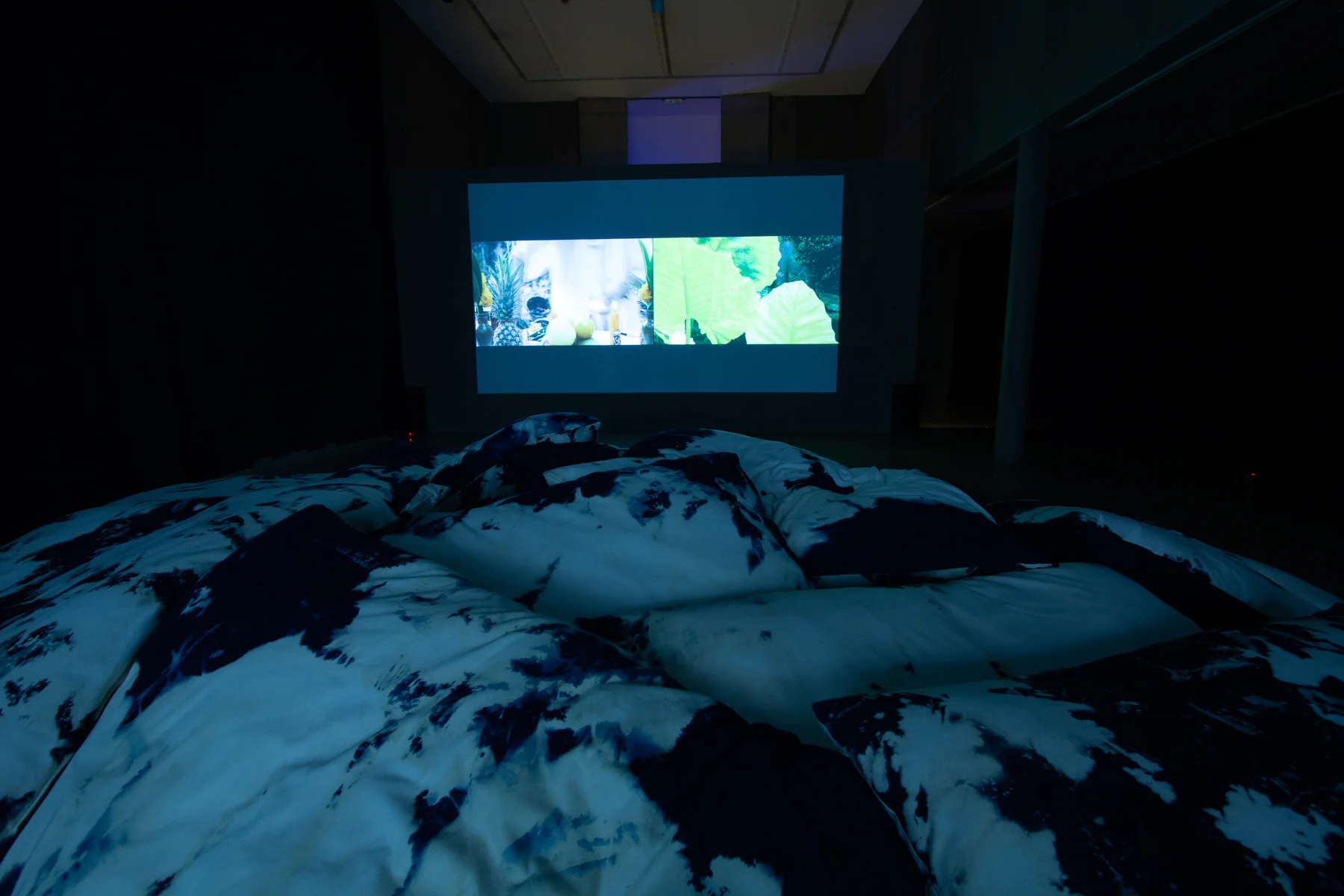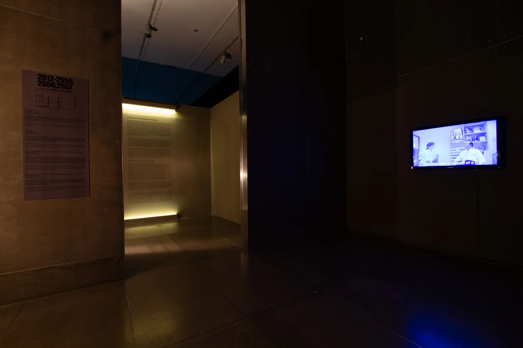 The trilogy 2012-2555, 2556, 2557 is a series of three videos, which are selected from four related performances and videos in a three-year production from 2012 to 2014. The year in which the artist made the artworks gives the work its title, but is expressed in the Buddhist Era (B.E.): 2555 for 2012, 2556 for 2013 and 2557 for 2014 respectively. In his naming concept, Korakrit plays with time through Buddhism and Christianity. A parallel between the Eastern culture and the Western is a central theme of the show – that is to say the artist’s reflections on globalization and the Internet.