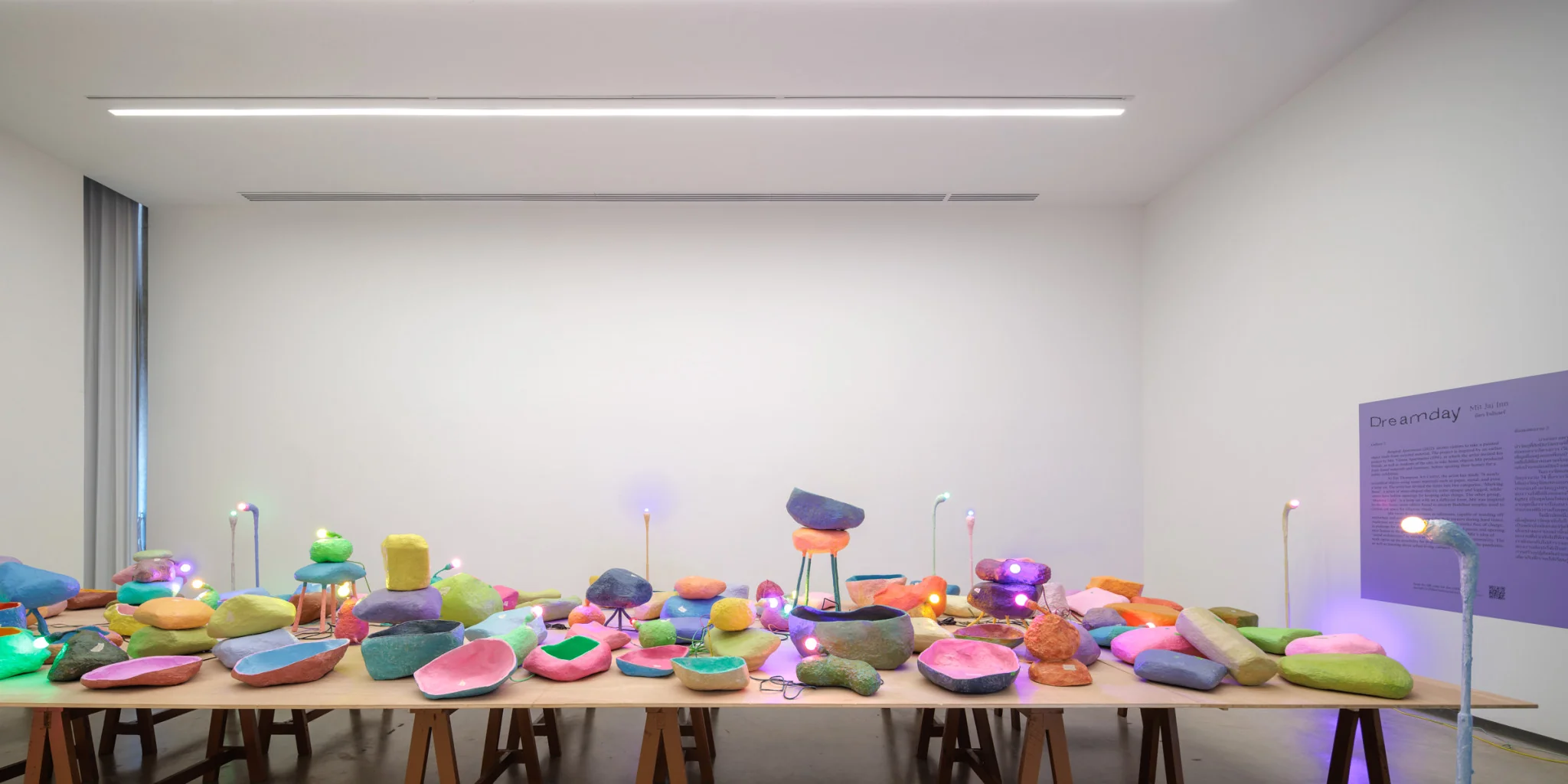 Dreamday สำรวจพลังแห่งการเยียวยาและพลังทางสังคมของศิลปะ ผ่านผลงานอันเปี่ยมชีวิตชีวาซึ่งเปิดให้ผู้ชมสามารถจับต้องสัมผัส มุดผ่าน เหยียบย่ำ หรือกระทั่งนำติดตัวกลับบ้าน โดยเปลี่ยนพื้นที่จัดแสดงงานของหอศิลป์บ้านจิม ทอมป์สัน ให้กลายเป็นเสมือนบ้านพักอาศัย ที่จะนำมาซึ่งการมีส่วนร่วมและการสร้างสรรค์สิ่งใหม่ ในห้องแสดงงานที่ 1 ศิลปินนำเสนอผลงาน Dream Tunnel (2564) ผลงานจิตรกรรมจัดวางที่ห้อมล้อมผู้ชมด้วยหมู่มวลเส้นสายหลากสีสัน ศิลปินตั้งใจใช้งานชิ้นนี้ช่วย “ชำระล้างความซบเซาหรือบาดแผลอันเจ็บปวด” Midlands Dwelling (2564) อ้างอิงจากถ้ำยุคก่อนประวัติศาสตร์ ที่ซึ่งมนุษย์ในยุคนั้นได้จดจารความฝันของพวกเขาผ่านจิตรกรรมบนผนังถ้ำ ผสานกับแรงบันดาลใจของศิลปินระหว่างที่เขาไปเยือนเมืองเบอร์มิงแฮม จนเกิดเป็นประติมากรรมเหล็กที่ล้อมรอบด้วยงานจิตรกรรมคล้ายโถงถ้ำ Dream Works (2542–)และ Loops (2562–) เป็นผลงานชุดจิตรกรรมบนผืนผ้าใบทั้งสองด้าน ที่ผ่านการตัดและผ่าเพื่อให้เกิดเส้นสายโค้งเว้าและรูปทรงบ่วง โดยสามารถจัดแสดงได้ทั้งการแขวนบนผนัง หรือวางบนพื้น