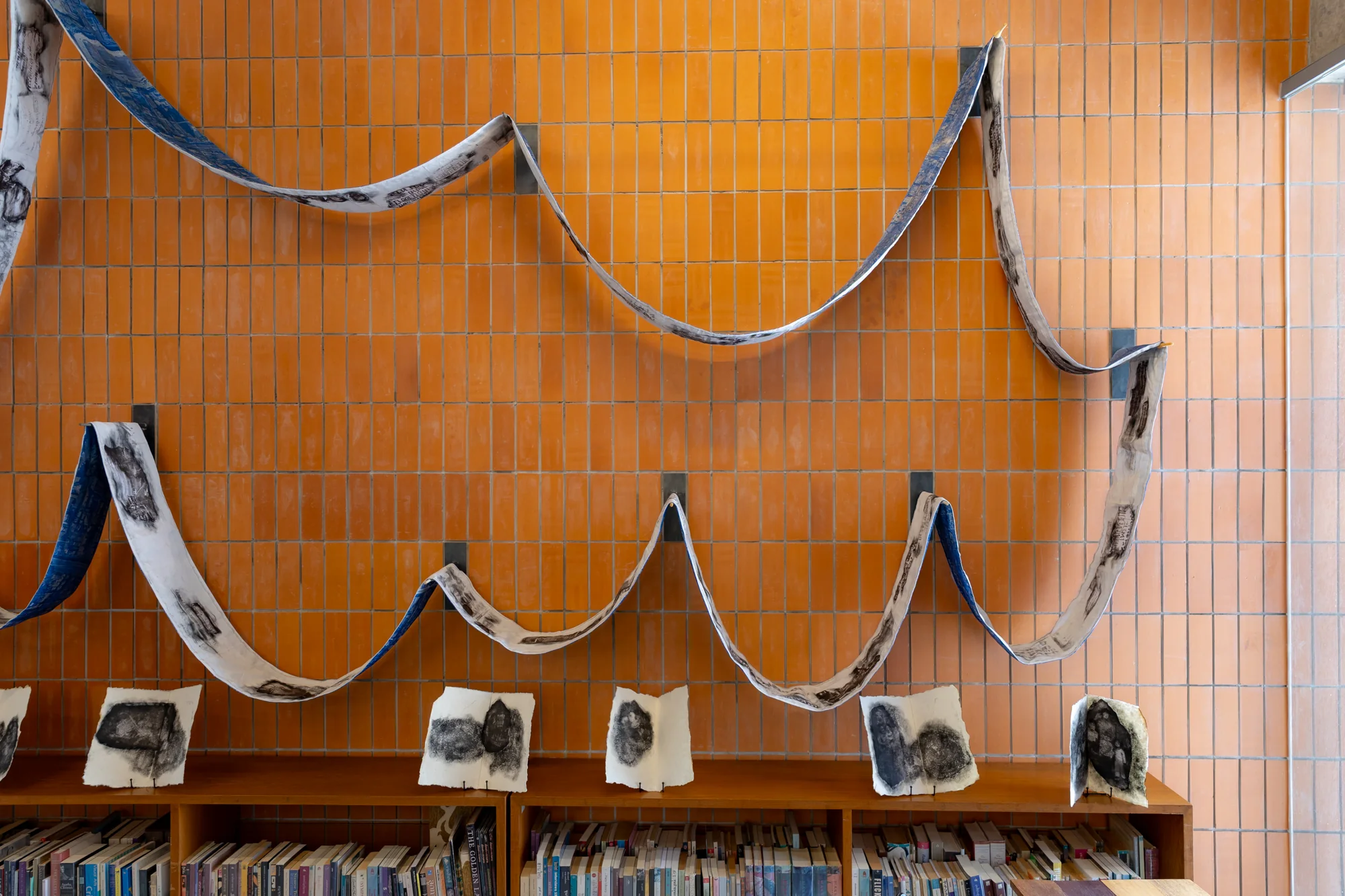 Keeta Isran, Ban Krua Ban Khaek, 2025. Embroidery, printing and soot painting on fabric, antique wooden spinning wheel, and video, Dimension variable. Photo: BACC. Courtesy of BACC © BACC