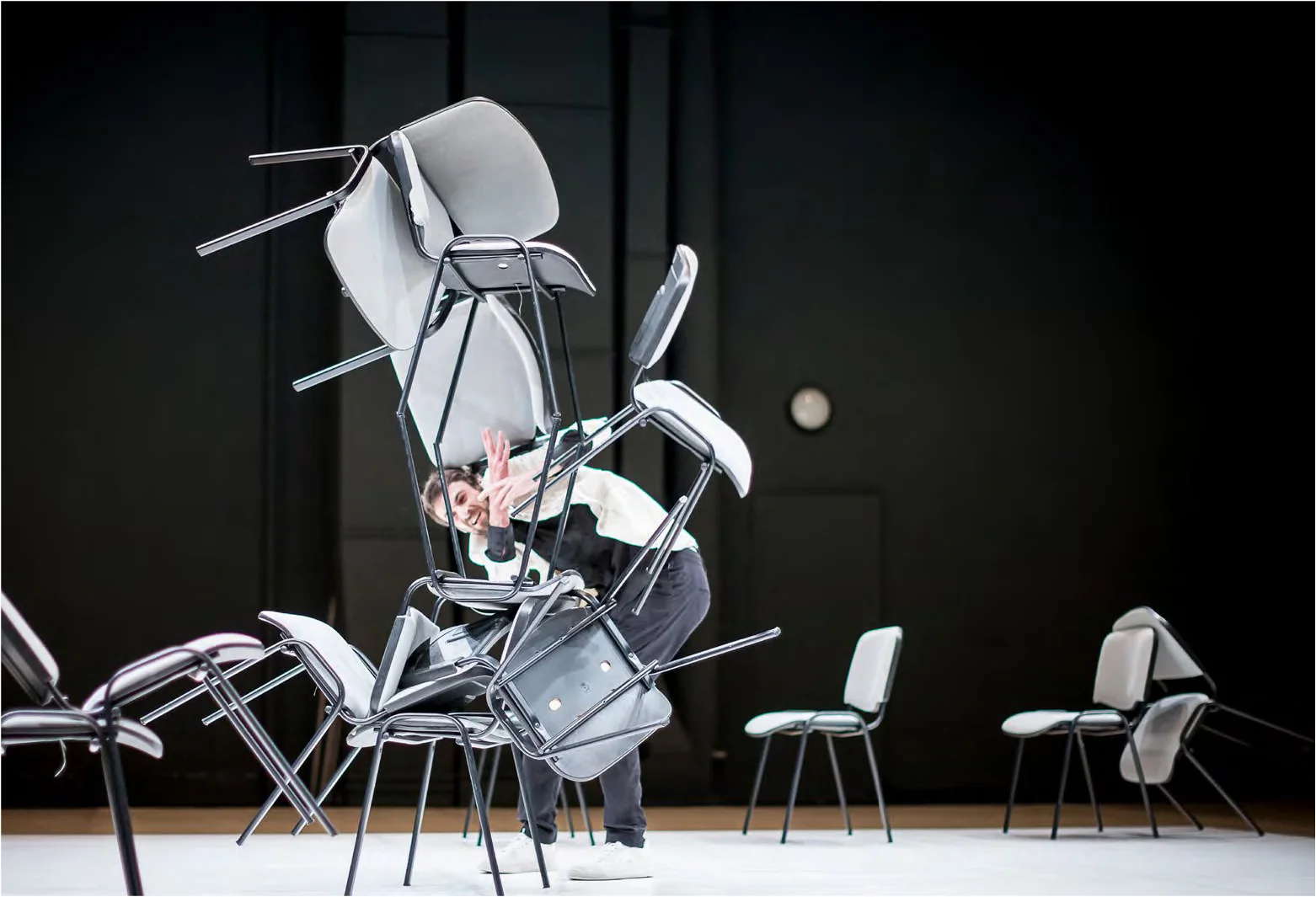 PLI brings together 22 conference chairs, obsessive rhythm and one devoted man. On a small platform, Viktor Černický dives resolutely into the effort for indefinite construction, reconstruction and deconstruction of the Universe. The outcome is an intelligent and playful solo—a physical metaphor for endless human dynamics, patience and striving that turns even the most ordinary objects into incredible pieces of architecture.
