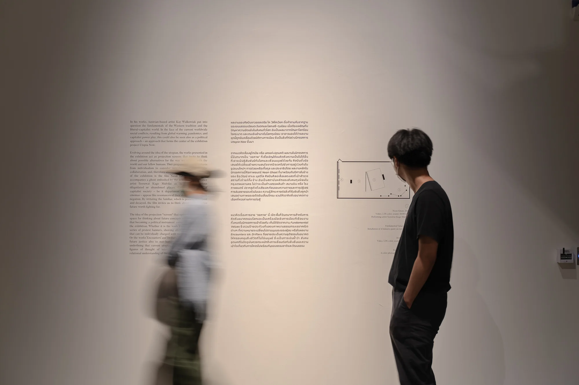 จากแนวคิดเรื่องยูโทเปีย หรือ นครแห่งอุดมคติ ผลงานในนิทรรศการนี้มีบทบาทเป็น “จอภาพ” ที่เชื้อเชิญให้ขบคิดถึงความเป็นไปได้อื่นที่เราจะมีปฏิสัมพันธ์กับโลกและเพื่อนมนุษย์ด้วยกัน ศิลปินตั้งข้อเสนอให้เปลี่ยนย้ายความสนใจจากปัจเจกไปยังการอยู่ร่วมกันในรูปแบบใหม่ๆ, การช่วยเหลือเกื้อกูล, และประชาธิปไตย ผลงานหลักในนิทรรศการนี้คือภาพยนตร์ Neon Ghost ที่มาพร้อมกับปีศาจในร่างของ ธีระวัฒน์ คาเงะ มุลวิไล นักแสดงศิลปะการแสดงสดที่เข้าสำรวจสถานที่เก่าแก่ทิ้งร้าง อันเป็นสถาบันหลักของสังคมทุนนิยมในกรุงเทพมหานคร ไม่ว่าจะเป็นห้างสรรพสินค้า สนามบิน หรือโรงภาพยนตร์ ปรากฏตัวดั่งเสียงสะท้อนของความตายและการปฏิเสธการล่มสลายของตัวมันเอง ความรู้สึก ระคายต่อสิ่งที่คุ้นชินซึ่งถูกนำเสนอผ่านภาพของอดีตอันเสื่อมโทรม ชวนให้เราคิดถึงอนาคตทางเลือกที่ควรค่าแก่การต่อสู้