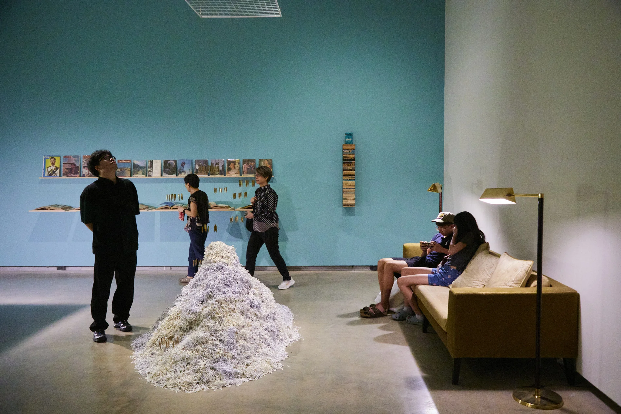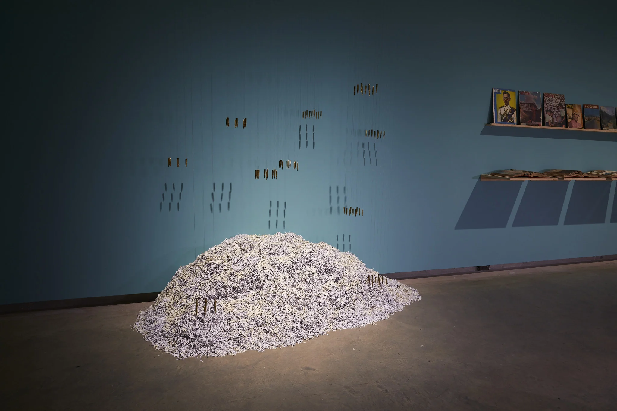 Installation: 360 bullet shells size 5.56 x 45 mm, copper wires No. 38, Banned/restricted books and propaganda books and magazines produced by the United States Information Service (USIS), a paper shredder, Strip-cut photocopy paper shreds (Greenleaf and white papers),