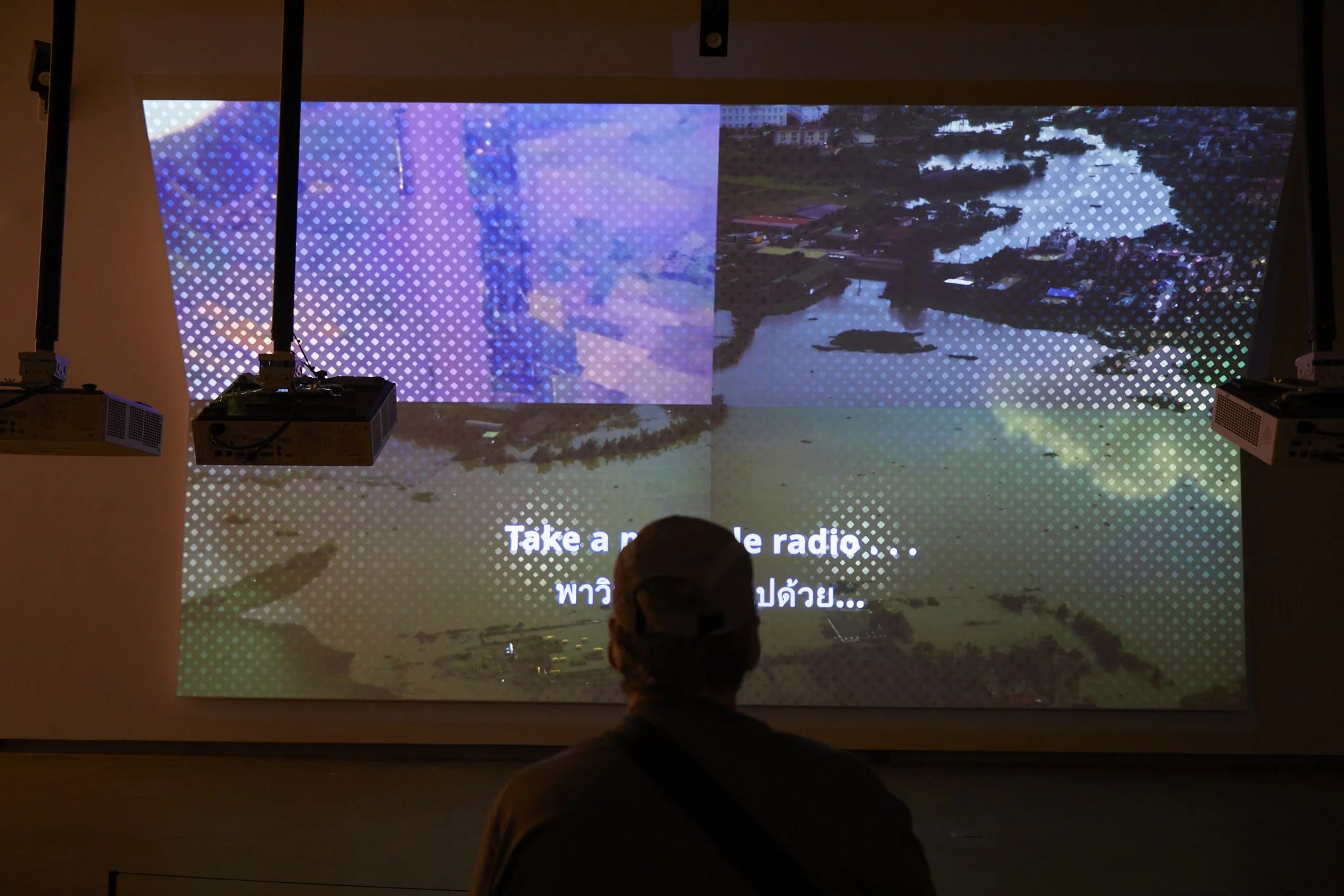 From over a thousand pieces of footage, Supaparinya composes a quiet, poetic meditation on change. Drifting between past and present, the work traces how rivers were redirected, villages submerged, and lives gradually reshaped. She juxtaposes stories of migration and displacement through subtle transitions and gentle rhythms. Reflective silver-dot stickers punctuate the curved four-channel projection like digital pixels, suggesting that contemporary landscapes are not only physical territories, but also mediated images—constructed, edited, and reframed.