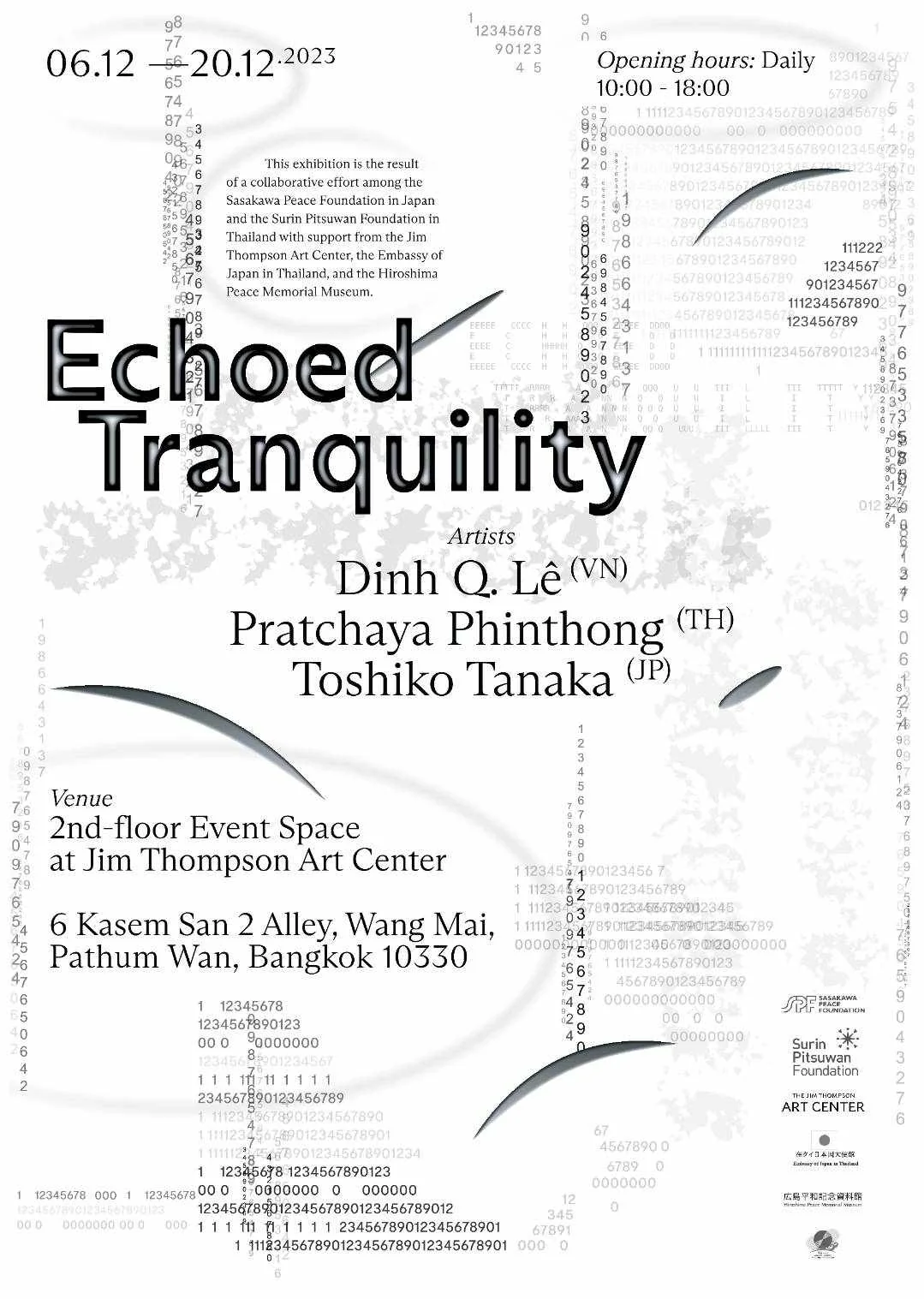 Echoed Tranquility is an art exhibition that delicately captures the essence of tranquility that emerges after conflicts. Through subtle and introspective artworks, the exhibition explores the journey of understanding and resilience in the aftermath of strife. It portrays the intricate interplay between brokenness and renewal. With its nuanced approach, Echoed Tranquility illuminates the subtle conversation and hopeful whispers that arise when shattered landscapes and souls find solace and serenity, embodying the delicate essence of lives after conflicts. The exhibition features a notable artwork by Dinh Q. Lê, 'South China Sea Pishkun' (2009), a new iteration of Pratchaya Phinthong's 'The Organ of Destiny' series, and a collection of enamel paintings by Toshiko Tanaka, who, as a survivor of the Hiroshima atomic bombing, transitioned into an artist.